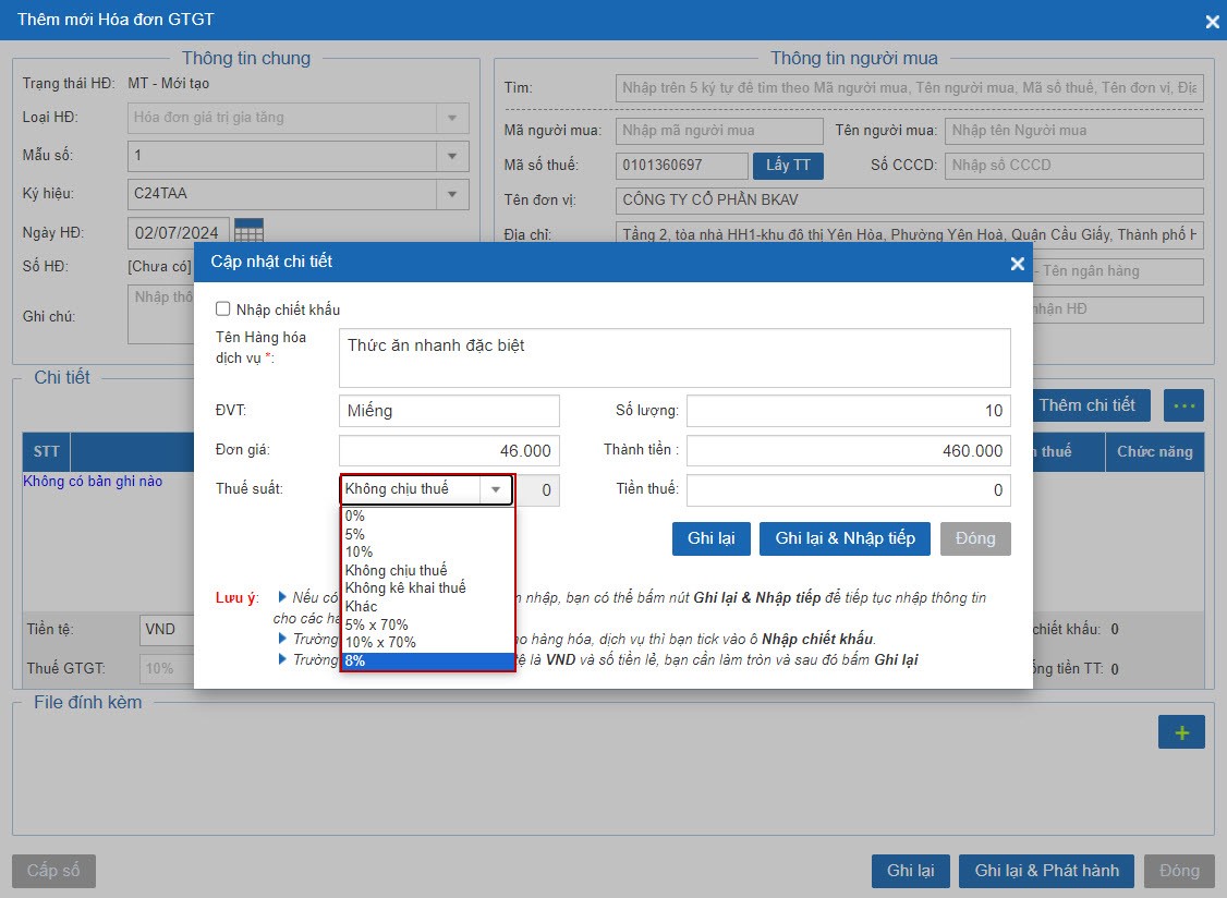 - Nếu đơn vị đang sử dụng mẫu hóa đơn thuế suất chi tiết (trên hóa đơn hiển thị nhiều mức thuế suất) để phát hành hóa đơn giảm thuế GTGT theo Nghị quyết 43/2022/QH15, Nghị quyết 101/2023/QH15 hoặc Nghị quyết 110/2023/QH15: Đơn vị tiếp tục sử dụng mẫu hóa đơn này để phát hành hóa đơn giảm thuế GTGT năm 2024 theo Nghị quyết 142/2024/QH15. Tại giao diện Thêm mới hóa đơn, dòng thuế suất chọn mức thuế suất 8%.