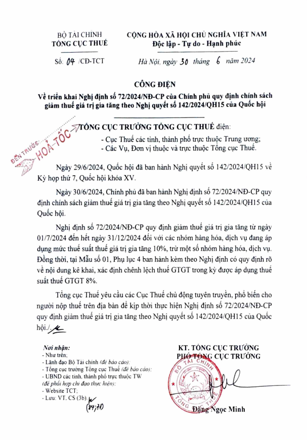 Ngày 30/06/2024, Tổng cục Thuế ban hành Công điện 04/CĐ-TCT triển khai Nghị định số 72/2024/NĐ-CP của Chính phủ quy định chính sách giảm thuế GTGT theo Nghị quyết số 142/2024/QH15 của Quốc hội.