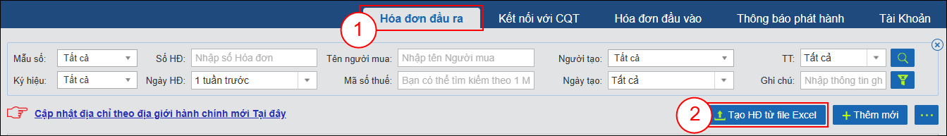 Bước 1: Truy cập và đăng nhập vào địa chỉ https://van.ehoadon.vn. Tại mục Hóa đơn đầu ra (1), bấm Tạo HĐ từ file Excel (2).
