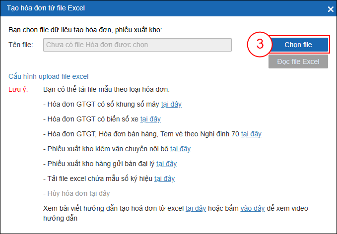 Bước 2: Cửa sổ “Tạo hóa đơn từ file Excel” hiển thị, bấm Chọn file (3).