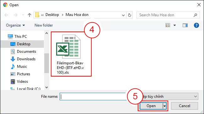 Bước 3: Bạn chọn file Excel vừa nhập thông tin Hóa đơn (4), sau đó bấm Open (5).