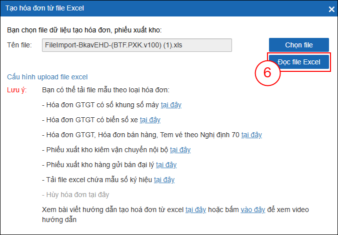 Bước 4: Sau khi chọn file Excel thành công, bấm Đọc file Excel (6).