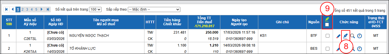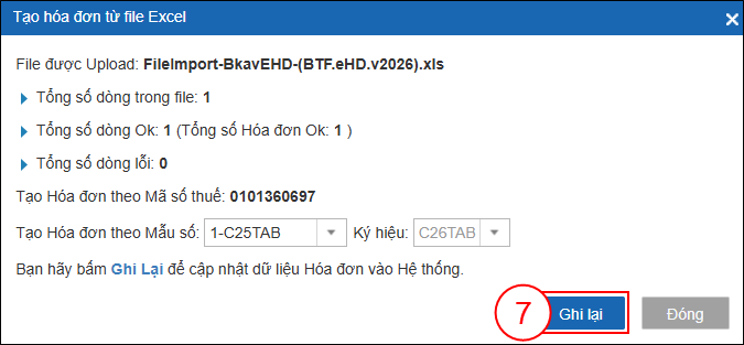 Bước 5: Hệ thống thực hiện đọc file và hiển thị tổng số dòng trong file, bấm Ghi lại (7) để upload dữ liệu Hóa đơn.