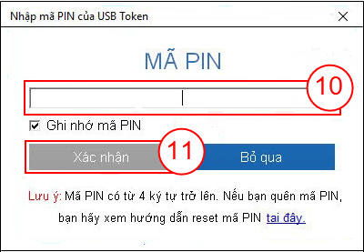 Bước 7: Cửa sổ "Nhập mã PIN của USB Token" hiển thị, bạn nhập mã PIN Chữ ký số (10), sau đó bấm Xác nhận (11).