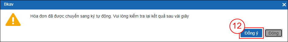 Lưu ý: Trường hợp đang sử dụng CKS Bkav HSM không cần nhập mã PIN, hệ thống sẽ hiện thị thông báo “Hoá đơn đã được chuyển sang ký tự động. Vui lòng kiểm tra lại kết quả sau vài giây”, Bạn bấm vào nút Đồng ý (13) để đóng cửa sổ này.
