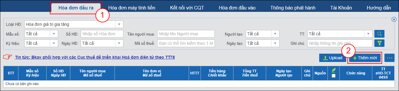 Bước 3: Tại mục Hóa đơn đầu ra (1), bấm Thêm mới (2).