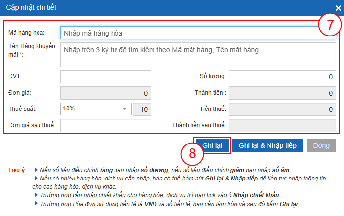 Bước 5: Trên giao diện Cập nhật chi tiết, Bạn nhập thông tin Hàng hóa dịch vụ (7), sau đó bấm nút Ghi lại (8) để quay về giao diện Thêm mới Hóa đơn.