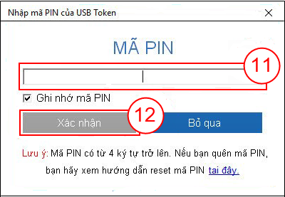 Bước 8: Cửa sổ "Nhập mã PIN của USB Token" hiển thị, nhập mã PIN Chữ ký số (11), sau đó bấm Xác nhận (12).