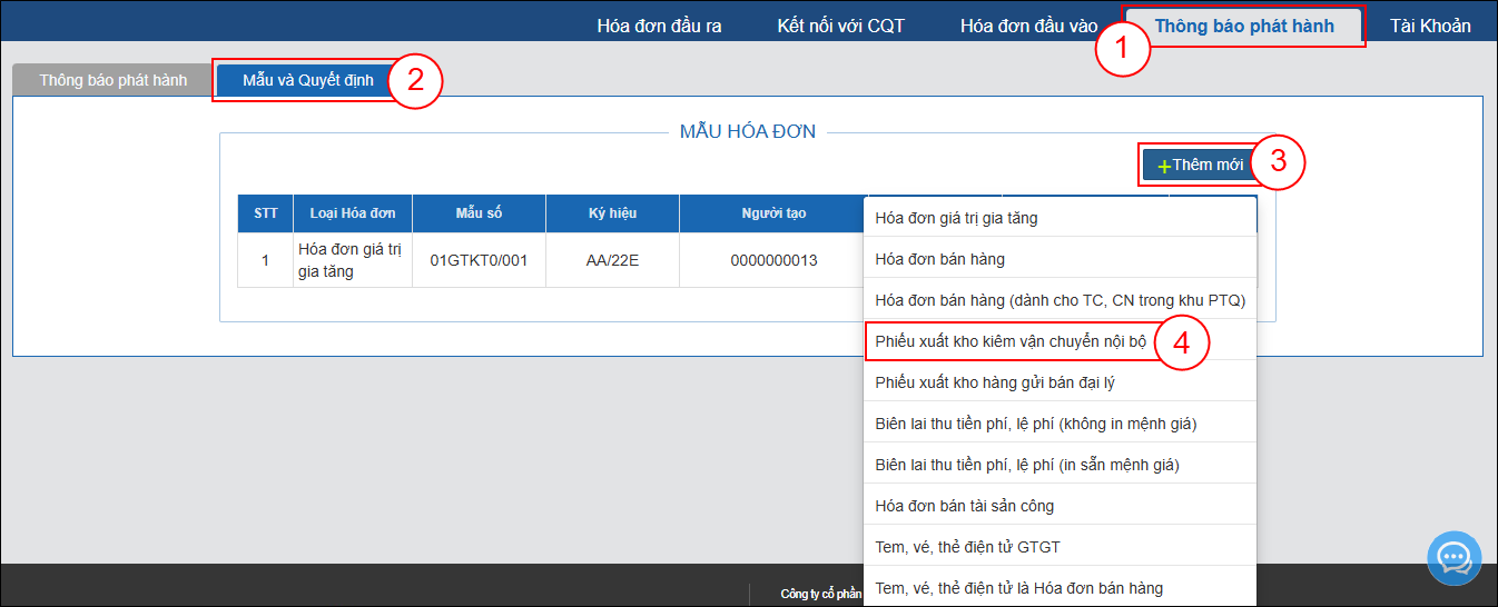 Bước 3: Tại mục Thông báo phát hành (1), Bạn bấm vào Mẫu và Quyết định (2), sau đó bấm Thêm mới (3). Danh sách mẫu hóa đơn hiện thị, Bạn bấm chọn Phiếu xuất kho kiêm vận chuyển nội bộ (4).