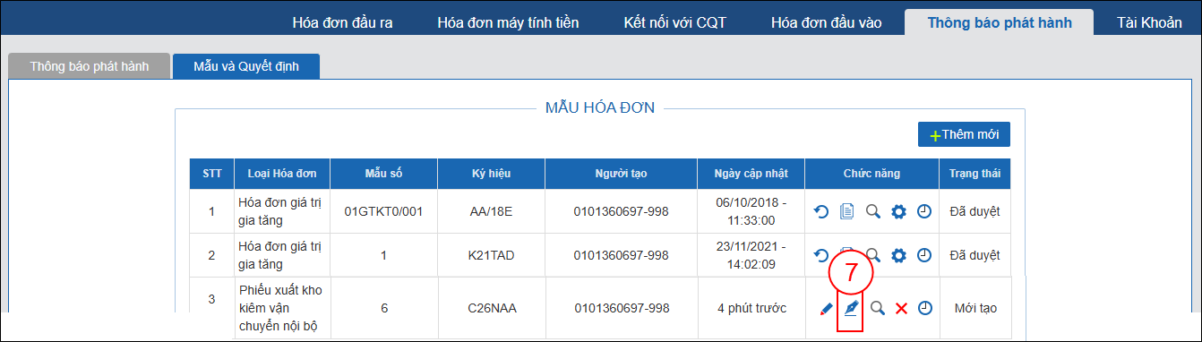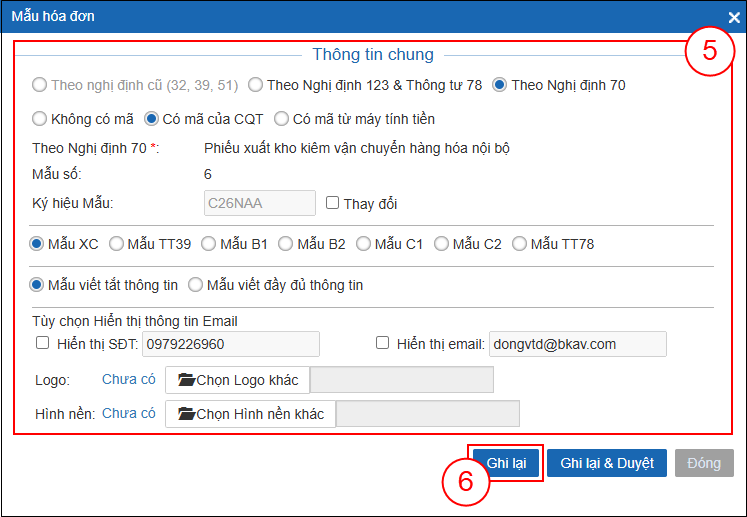 Sau đó bấm Ghi lại (6) để quay về giao diện danh sách Mẫu Hóa đơn.