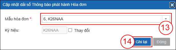 Bước 8: Hệ thống hiển thị giao diện Cập nhật dải số Thông báo phát hành Hoá đơn, Bạn chọn Mẫu hoá đơn (13) đã tạo ở Bước 3, sau đó bấm Ghi lại (14).