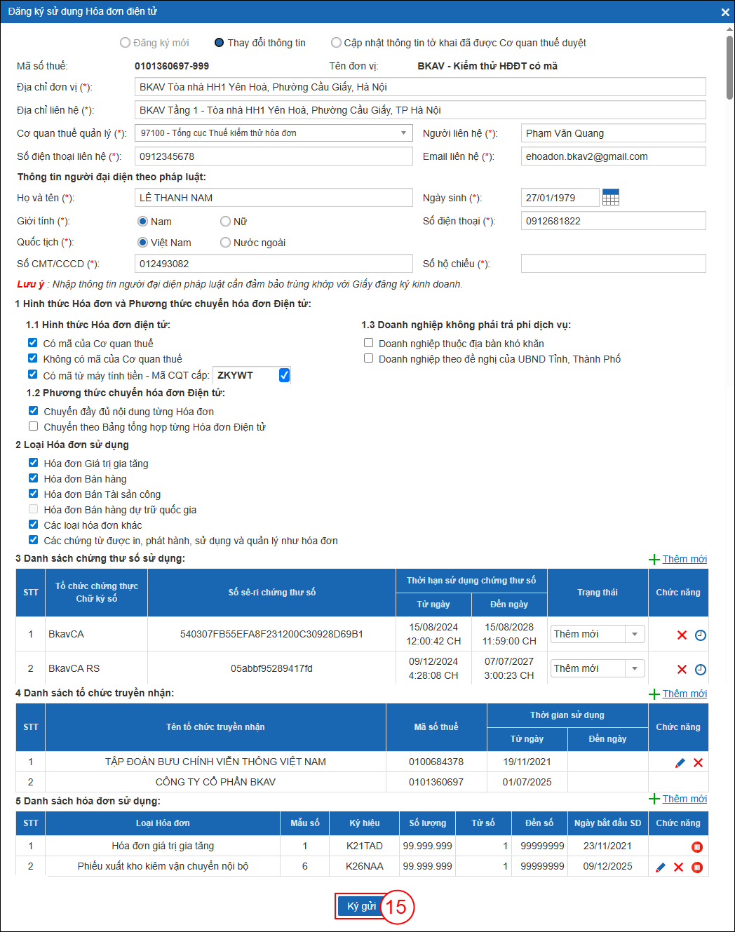 Bước 9: Hệ thống quay về giao diện Đăng ký sử dụng Hoá đơn điện tử, Bạn bấm Ký gửi (15) để gửi tờ khai đăng ký lên Cơ quan Thuế.