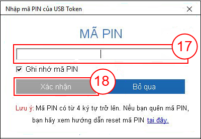 Bước 10: Cửa sổ "Nhập mã PIN của USB Token" hiển thị, nhập MÃ PIN (17), sau đó bấm Xác nhận (18).
