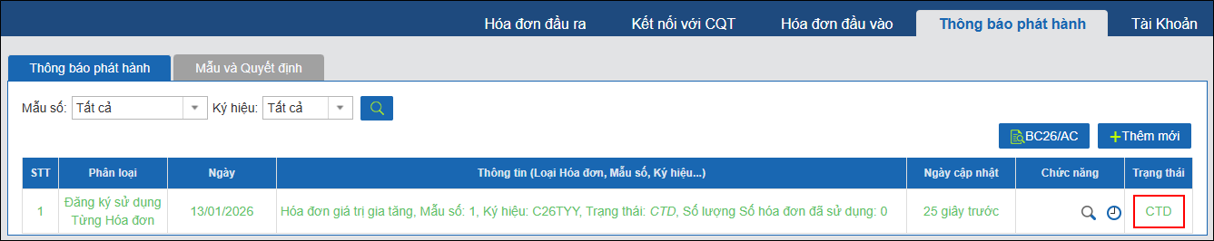 Sau khi ký gửi tờ khai Đăng ký thông tin sử dụng Hóa đơn Điện tử thành công, hệ thống sẽ tự động cập nhật thông tin tờ khai vào mục Thông báo phát hành.