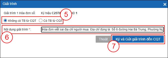 Bước 5: Cửa sổ “Giải trình” hiện ra, Bạn chọn “Không có TB từ CQT (chủ động giải trình khi phát hiện sai sót) hoặc Có TB từ CQT (chỉ chọn trong trường hợp Cơ quan Thuế phát hiện chứng từ điện tử đã lập có sai sót thì Cơ quan Thuế thông báo” (5). Sau đó Bạn nhập Nội dung giải trình (6) và bấm Ký và Gửi giải trình đến CQT (7).