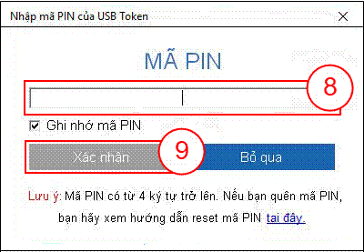 Bước 6: Cửa sổ "Nhập mã PIN của USB Token" hiển thị, Bạn nhập MÃ PIN (8), sau đó bấm Xác nhận (9).