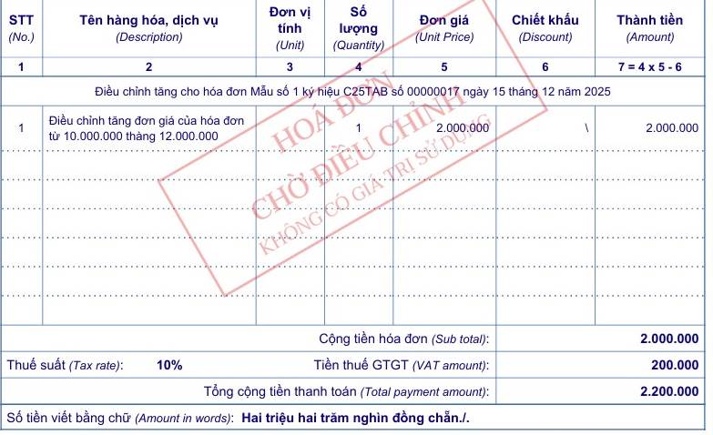 Sau khi phát hành hóa đơn, kế toán phát hiện đơn giá đúng phải là 12.000.000đ.
