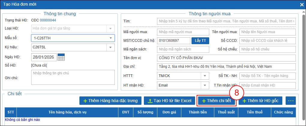 Bước 6: Hệ thống hiển thị giao diện Tạo Hóa đơn mới với trạng thái Hóa đơn là CĐC – Hóa đơn Chờ điều chỉnh. Bạn chọn Thêm chi tiết (8).