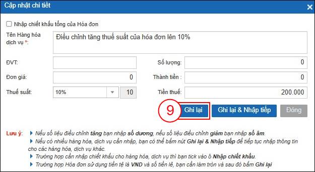 Bước 7: Nhập Thuế suất 10%, Tiền thuế tăng tương ứng 2% chênh lệch là 200.000đ . Số lượng, Đơn giá, Thành tiền không đổi nên sẽ để mặc định là 0đ. Sau đó, bấm Ghi lại (9).
