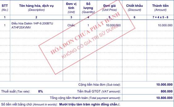- Thuế suất VAT trên hóa đơn gốc ghi : 8%