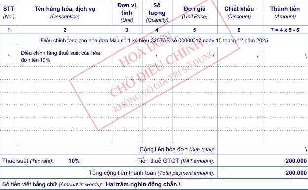 Dưới đây là hình ảnh hóa đơn gốc bị sai và hóa đơn điều chỉnh: