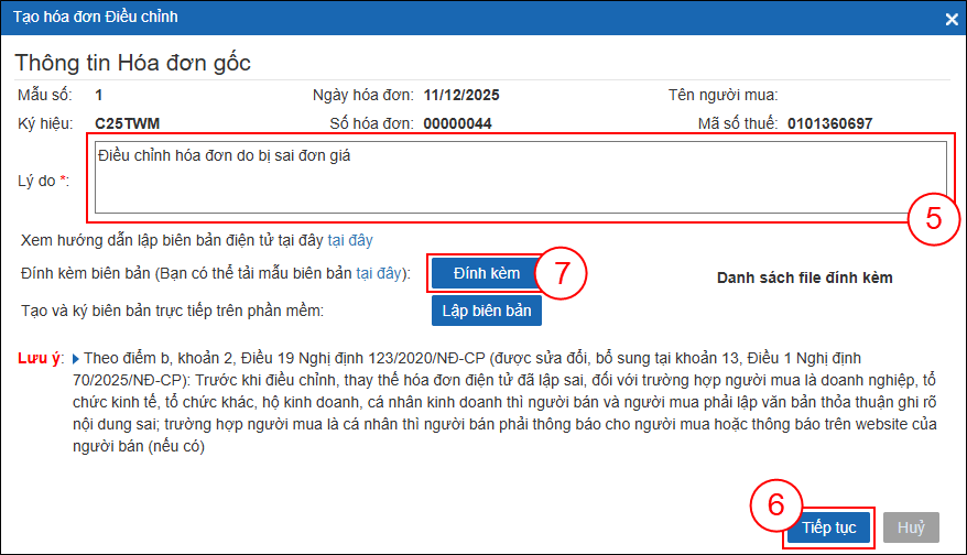 Bước 3: Cửa sổ "Tạo hoá đơn Điều chỉnh” xuất hiện, Bạn nhập lý do Điều chỉnh Hóa đơn (5), sau đó bấm Tiếp tục (6).