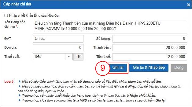 Bước 5: Nhập Thành tiền tăng thêm 10.000.000đ để tổng thành tiền của hóa đơn F0 + F1 là 20.000.000đ, các nội dung khác không thay đổi thì Bạn để trống. Sau đó, bấm Ghi lại (9).
