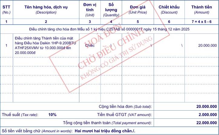 Dưới đây là hình ảnh hóa đơn gốc bị sai và hóa đơn điều chỉnh: