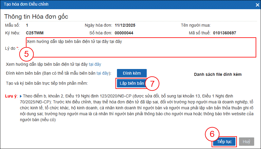 Bước 3: Cửa sổ "Tạo hoá đơn Điều chỉnh” xuất hiện, Bạn nhập lý do Điều chỉnh Hóa đơn (5), sau đó bấm Tiếp tục (6).