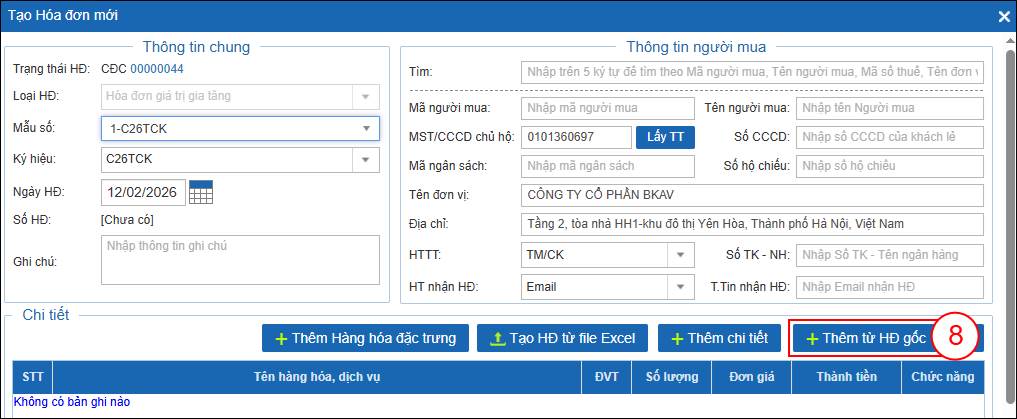 Bước 4: Hệ thống hiển thị giao diện Tạo Hóa đơn mới với trạng thái Hóa đơn là CĐC – Hóa đơn Chờ điều chỉnh. Bạn chọn Thêm từ HĐ gốc (8).