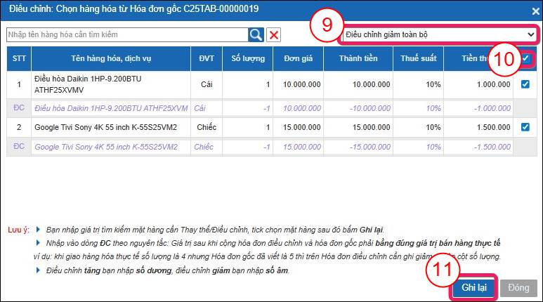 Bước 5: Tại cửa sổ chọn hàng hóa từ Hóa đơn gốc, Bạn chọn loại điều chỉnh là Điều chỉnh giảm toàn bộ (9). Sau đó, chọn tất cả các hàng hóa từ Hóa đơn gốc để thêm vào Hóa đơn mới