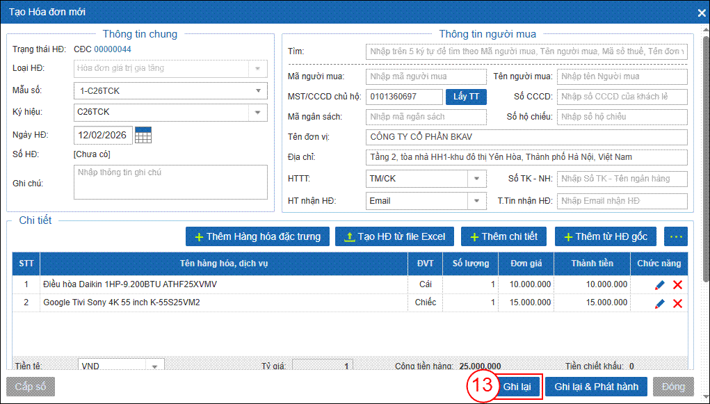 Bước 6: Giao diện Tạo Hóa đơn mới hiển thị, Bạn kiểm tra lại thông tin sau đó bấm Ghi lại (13) để quay về giao diện Hóa đơn đầu ra.