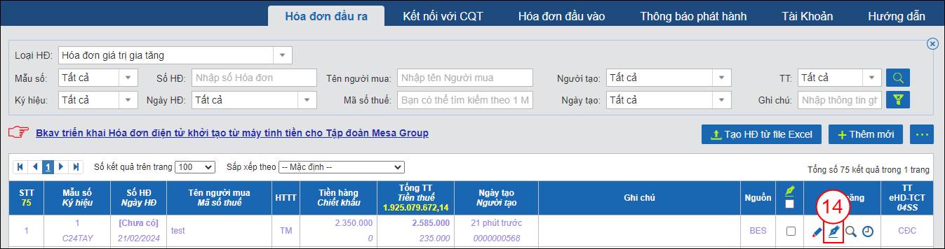 (14) để Ký và phát hành Hóa đơn.