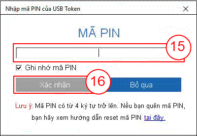 Bước 8: Cửa sổ "Nhập mã PIN của USB Token" hiển thị, nhập mã PIN Chữ ký số (15), sau đó bấm Xác nhận (16).