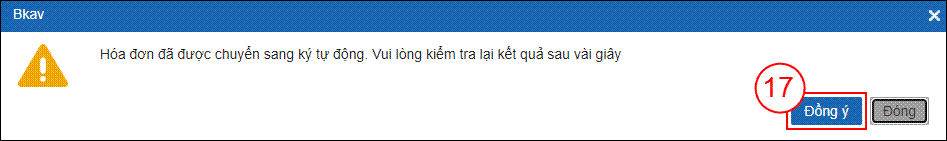 Lưu ý: Trường hợp đang sử dụng CKS Bkav HSM không cần nhập mã PIN, hệ thống sẽ hiện thị thông báo “Hoá đơn đã được chuyển sang ký tự động. Vui lòng kiểm tra lại kết quả sau vài giây”, Bạn bấm vào nút Đồng ý (17) để đóng cửa sổ này.