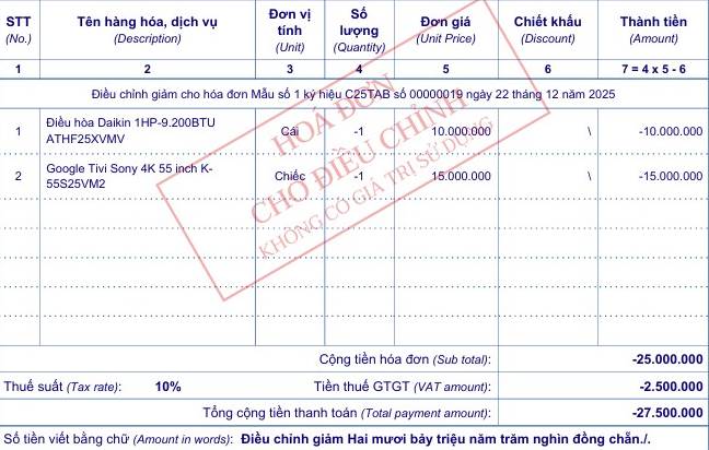 Dưới đây là hình ảnh hóa đơn gốc bị sai và hóa đơn điều chỉnh: