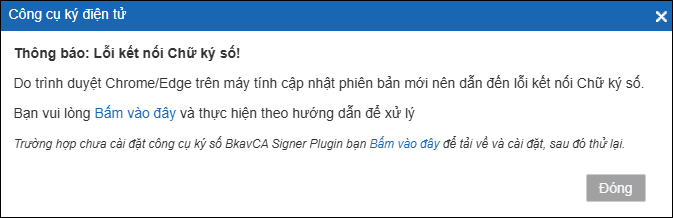 VẤN ĐỀ: Trường hợp đã cài Công cụ ký điện tử BkavCA Signer Plugin nhưng khi ký hoá đơn có "Thông báo: Lỗi kết nối Chữ ký số!"