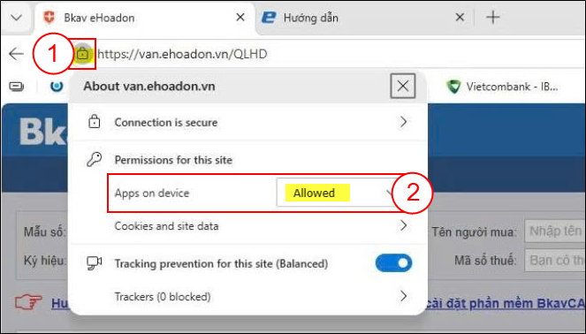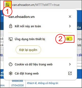 (1) trên thanh địa chỉ trình duyệt sau đó bấm vào (2) để mở quyền “Ứng dụng trên thiết bị” (Apps on device).