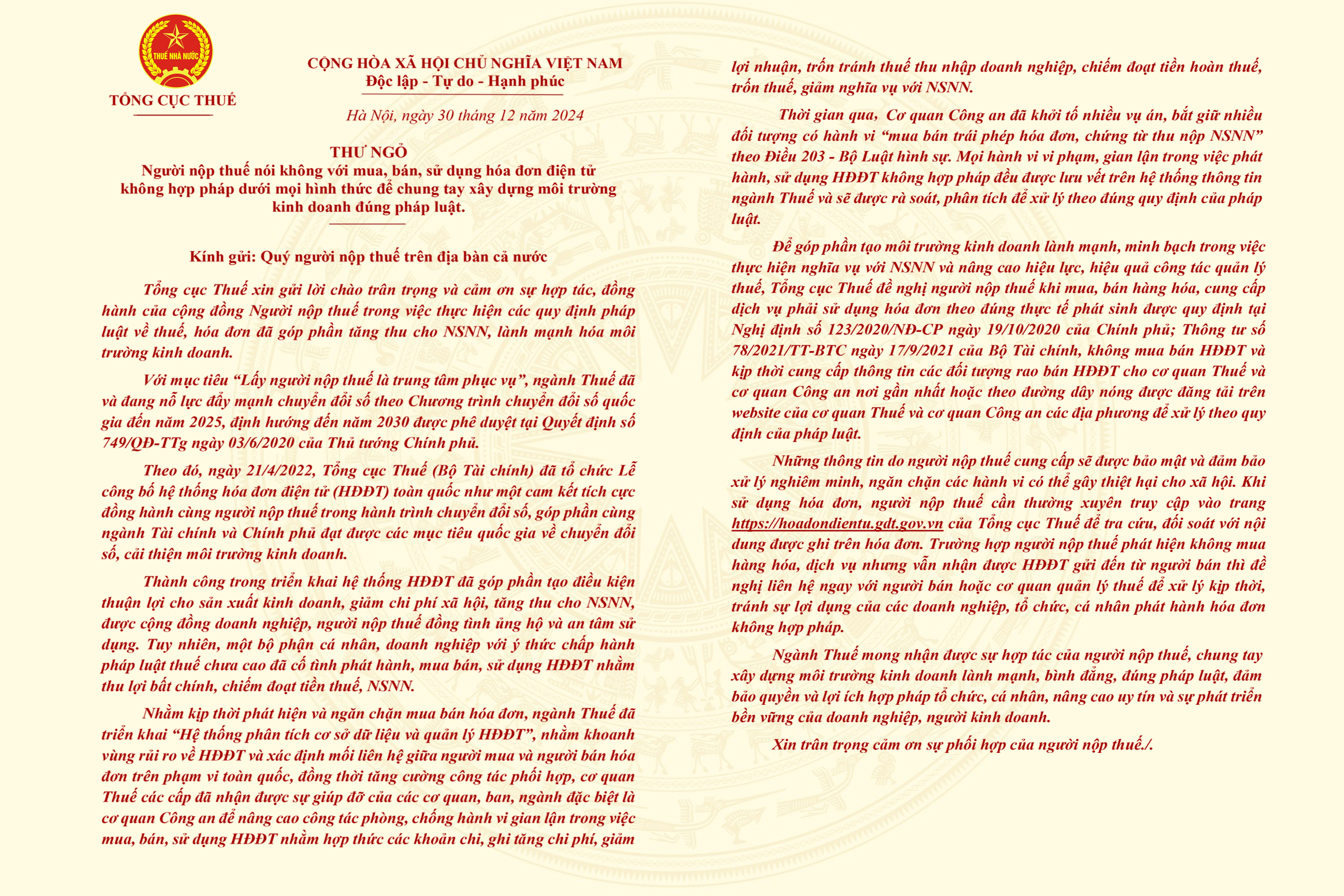 Nói không với mua, bán và sử dụng hóa đơn không hợp pháp - ngành Thuế gửi...