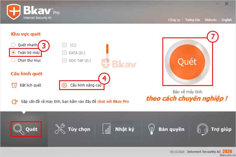 Bước 4: Bấm vào nút Quét (7) để thực hiện quét virus toàn bộ máy tính.